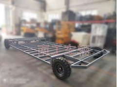 3、本车共有4个22-14-16的轮胎,单轮承载6吨,前轮转向,后轮驱动。车桥设计理念为刚性悬挂式,可根据路面平整度,自行调整车体水平及轮胎负载力均衡。行驶速度0-5Km每小时。